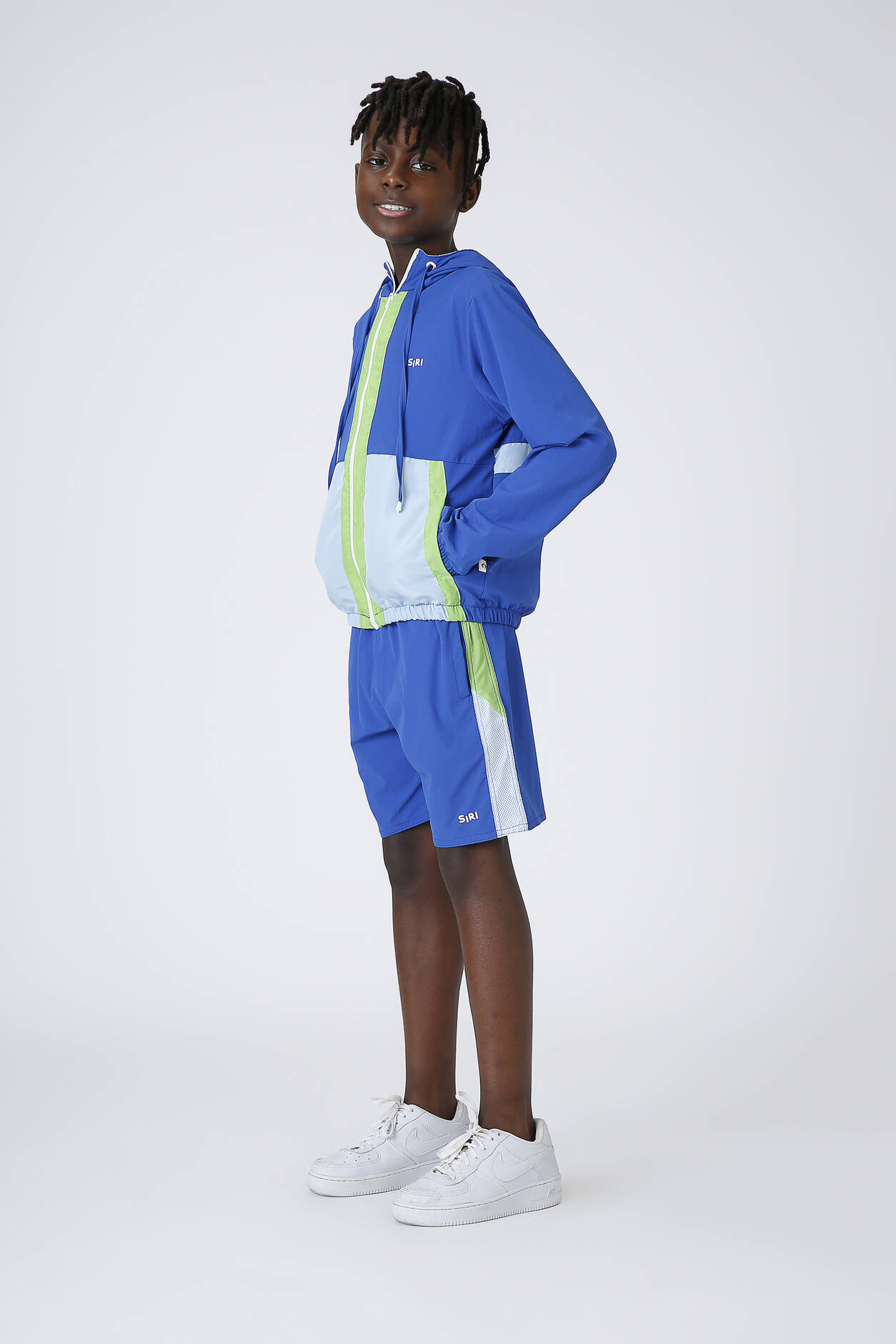 Bermuda masculina com elastano nas cores azul com verde. A bermuda Siri é perfeita para a prática e também para a hora da brincadeira, deixando a criança livre nos seus movimentos.