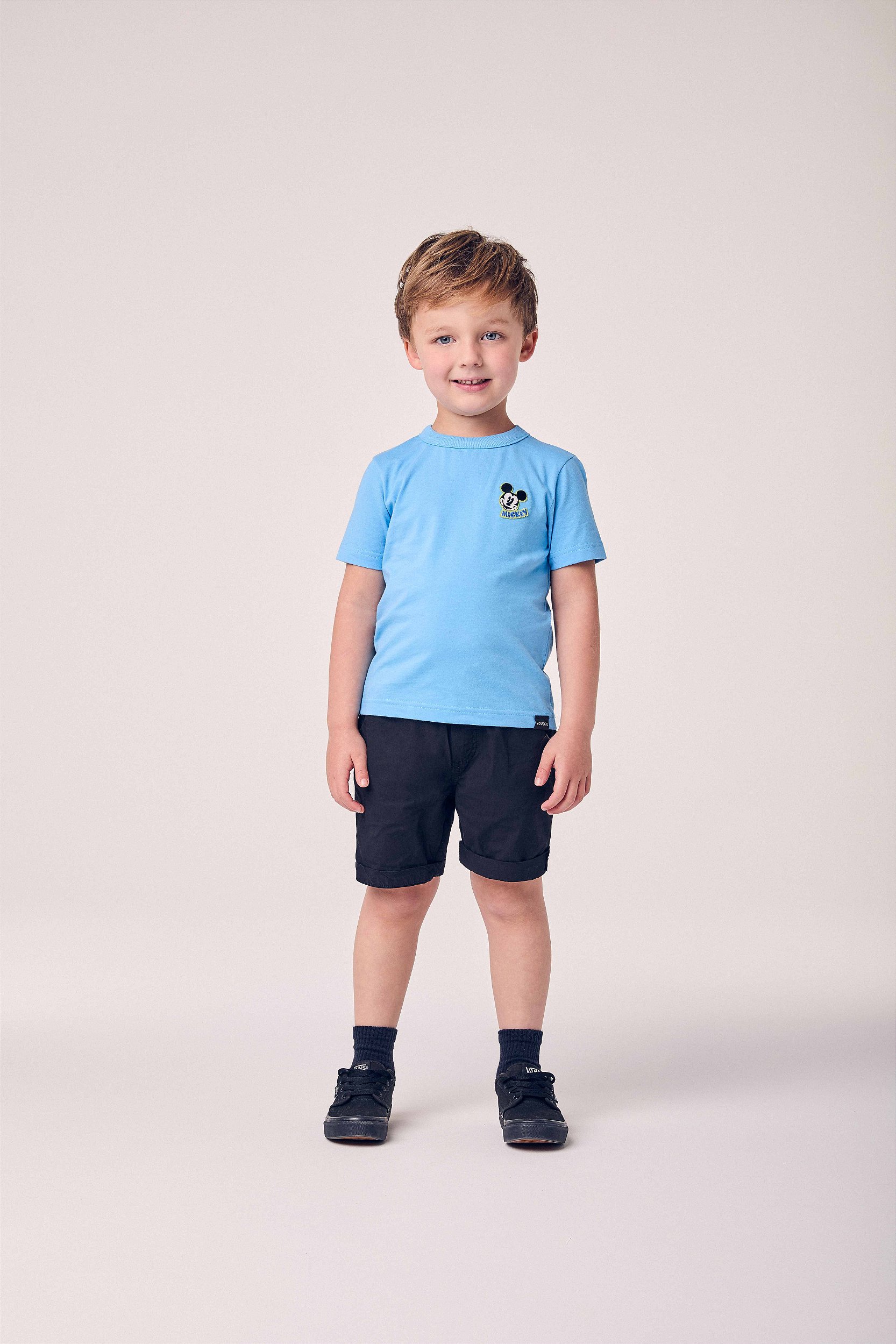 Super leve e estilosa, a camiseta azul destaca o icônico Mickey em bordado no peito. Uma peça básica que transforma qualquer produção, trazendo cor e alegria para os looks de verão dos meninos. Ideal para usar sozinha ou em sobreposições, sempre com conforto e personalidade.