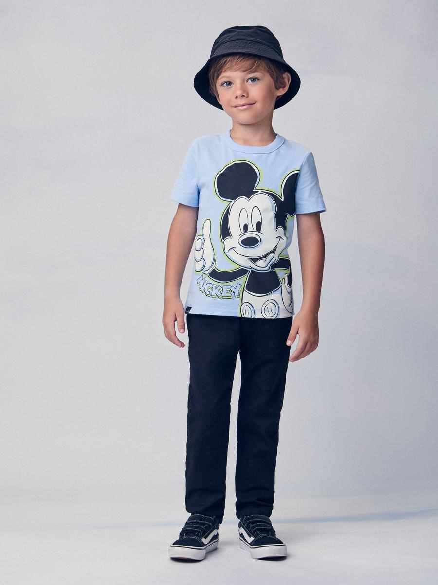 Camiseta azul claro com estampa frontal do Mickey em estilo maxi print, trazendo um ar lúdico e descontraído ao visual. O desenho em traços marcantes confere atitude e modernidade à peça, perfeita para looks casuais de verão.