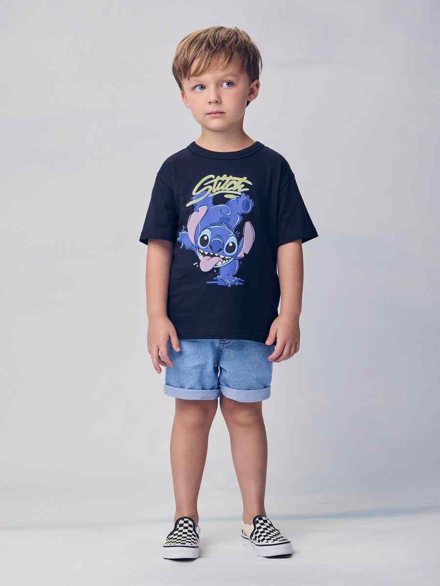 A camiseta preta entra na cena com uma pegada vibrante, destacando a estampa do Stitch em traços gráficos e efeito neon. Um modelo que traduz a energia descontraída do verão com atitude e estilo, ideal para explorar memórias à beira-mar ou passeios urbanos.