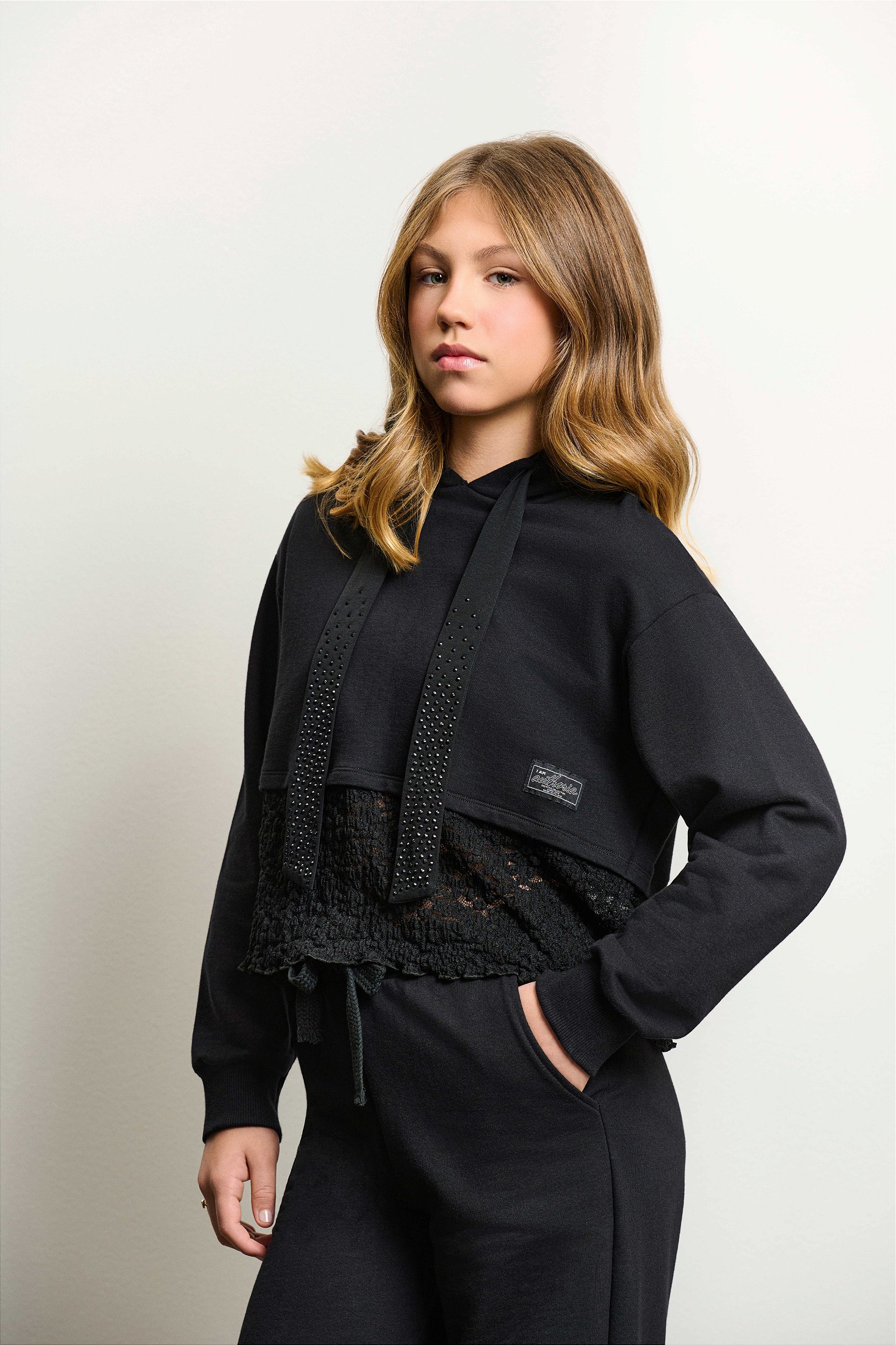 Casaco de Moletom com detalhe em renda no barrado. Em seus detalhes possui capuz com detalhe fita com strass.
