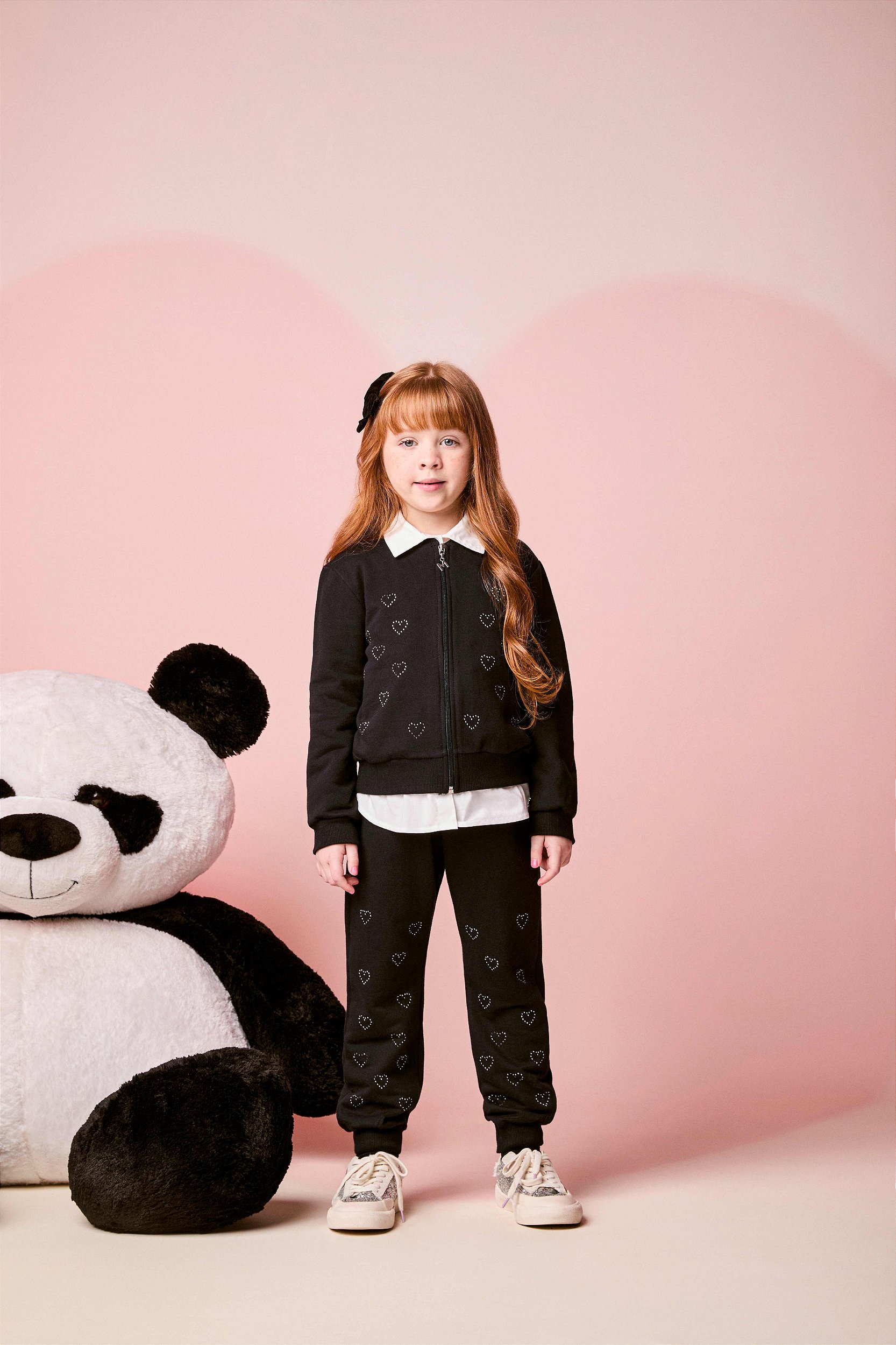 Conjunto de moletom composto por jaqueta e calça comdetalhes em coraçõezinhos.