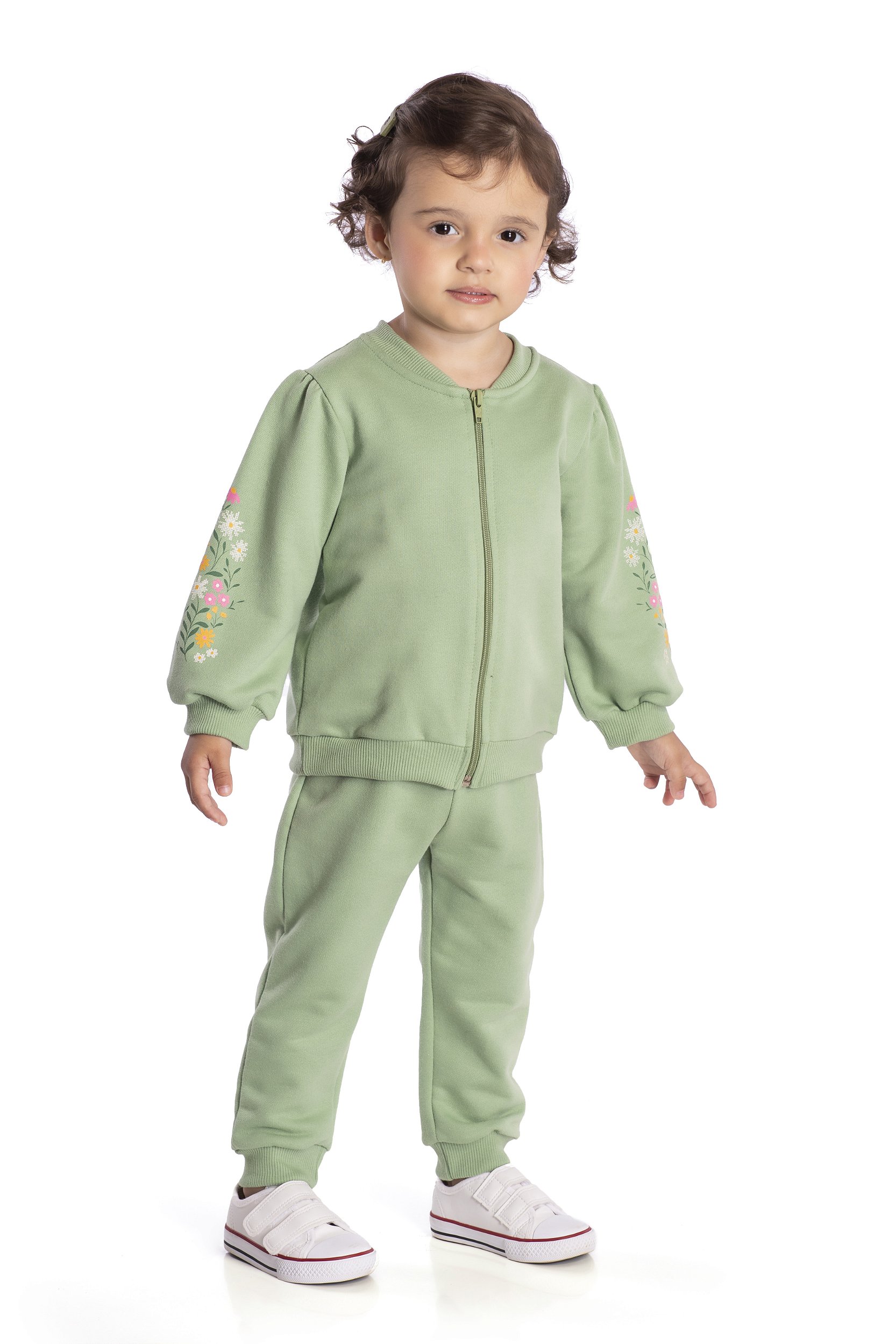 Conjunto de moletom com casaco e calça. Em seus detalhes esse lindo conjunto na cor verde menta possui as mangas bufantes com detalhe de aplicação de flores. Uma peça essencial para os dias mais frios.
