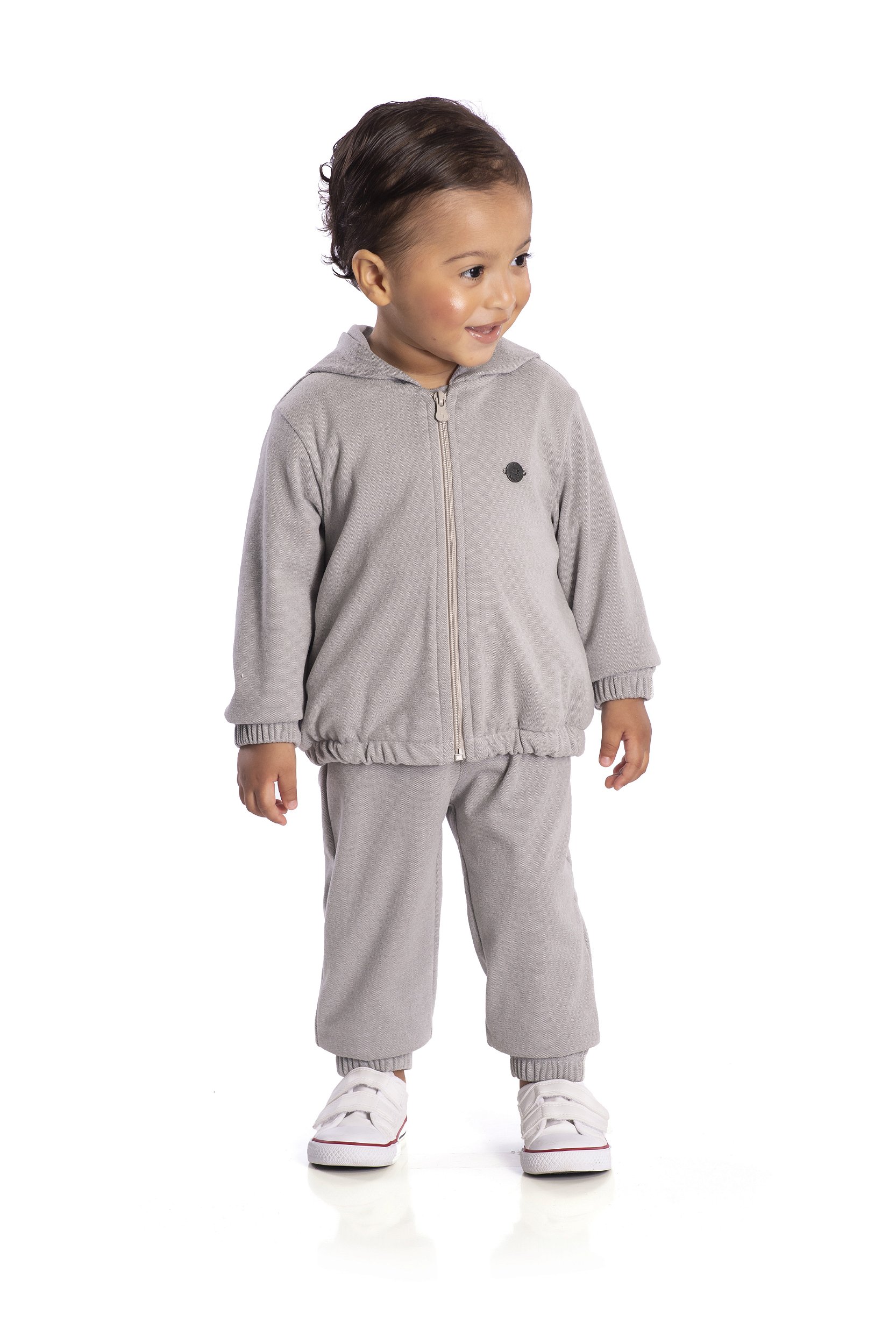 O conjunto em malha soft cinza Nini e Bambine se destaca pelo toque aveludado da malha, fazendo com que esse look seja extremamente confortável. Em seus detalhes, esse lindo conjunto possui jaqueta com fechamento em zíper e capuz e calça com punho.