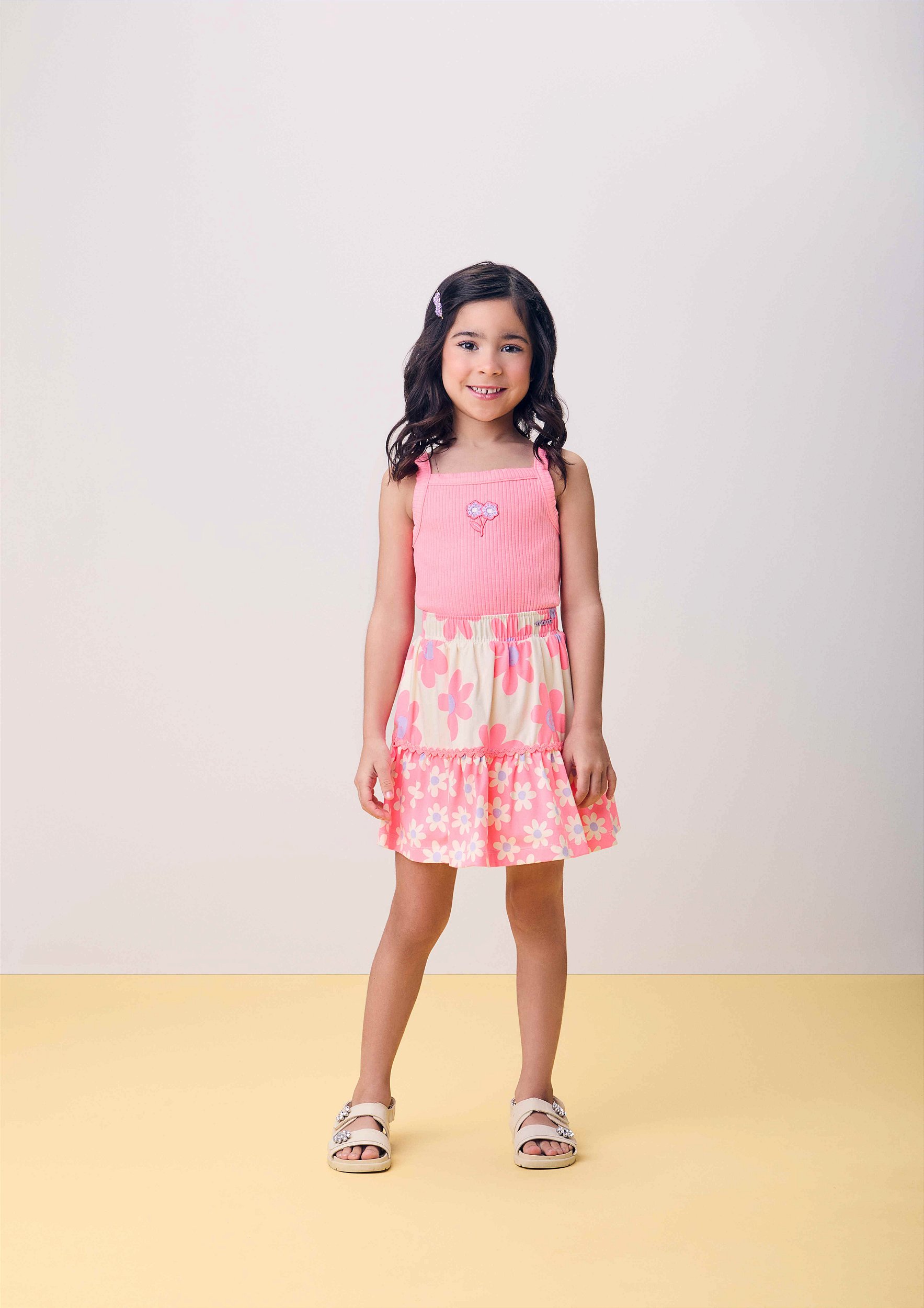Este conjunto descontraído e moderno é a escolha ideal para quem adora estilo e conforto. A regata rosa apresenta uma estampa flor no pink, complementada pela saia rosa com a mesma estampa, criando um look único e cheio de personalidade. Perfeito para passeios ou para um dia cheio de diversão