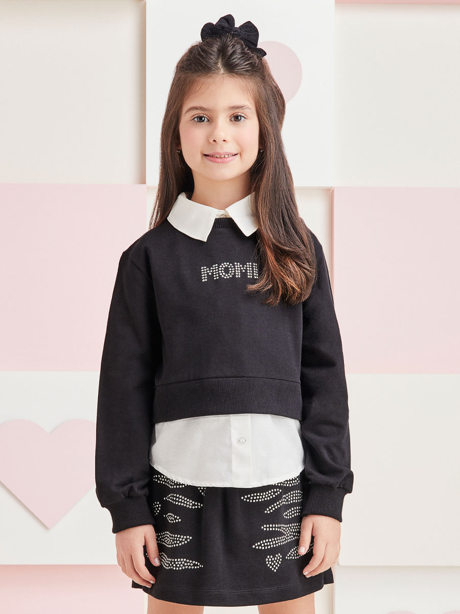 Elegância e conforto se unem no Conjunto Infantil Momi em preto. Confeccionado em moletinho sem felpa, o conjunto proporciona maciez e liberdade de movimento. O casaco, com barra em tecido plano, simula a sofisticação de uma camisa, adicionando um toque moderno. A saia apresenta elástico no cós para ajuste perfeito.