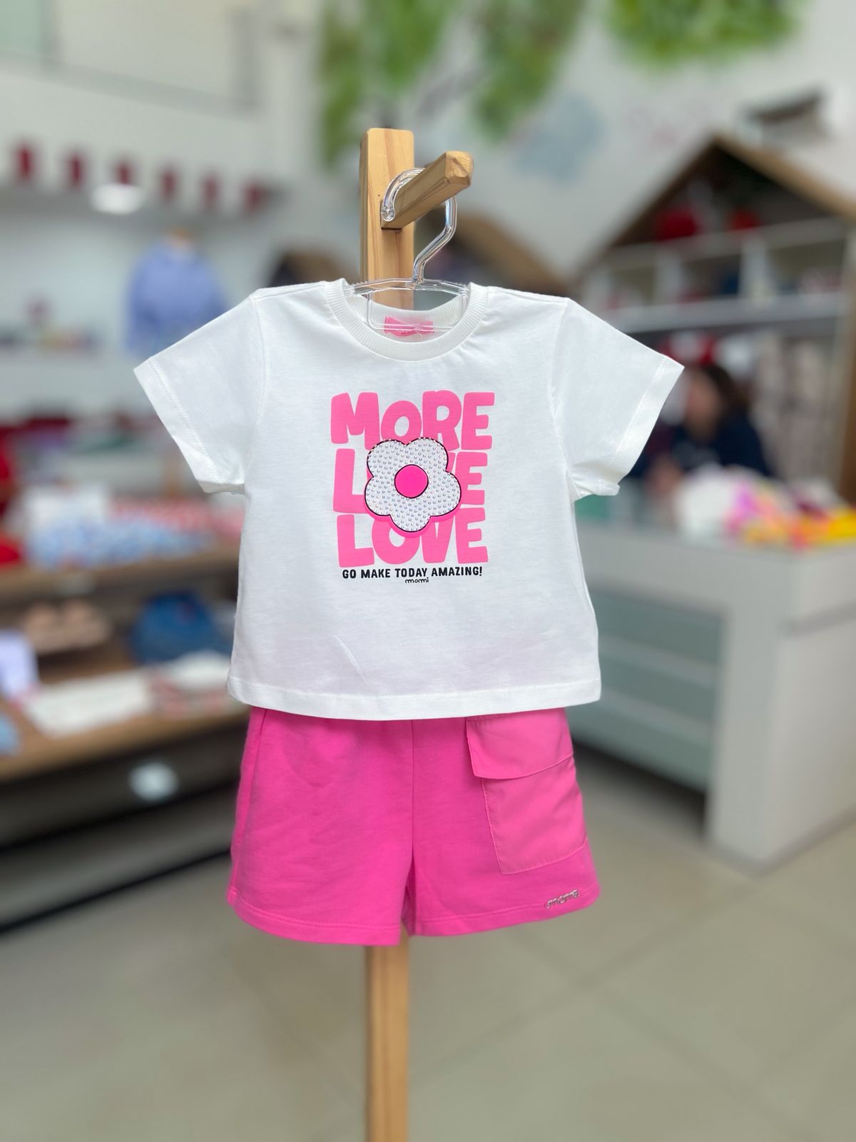 Cheio de fofura, esse conjunto traz uma blusa branca com estampa de florzinha e detalhes delicados, acompanhada de um short na cor rosa. Um look alegre e confortável para dias especiais e momentos de brincadeira.