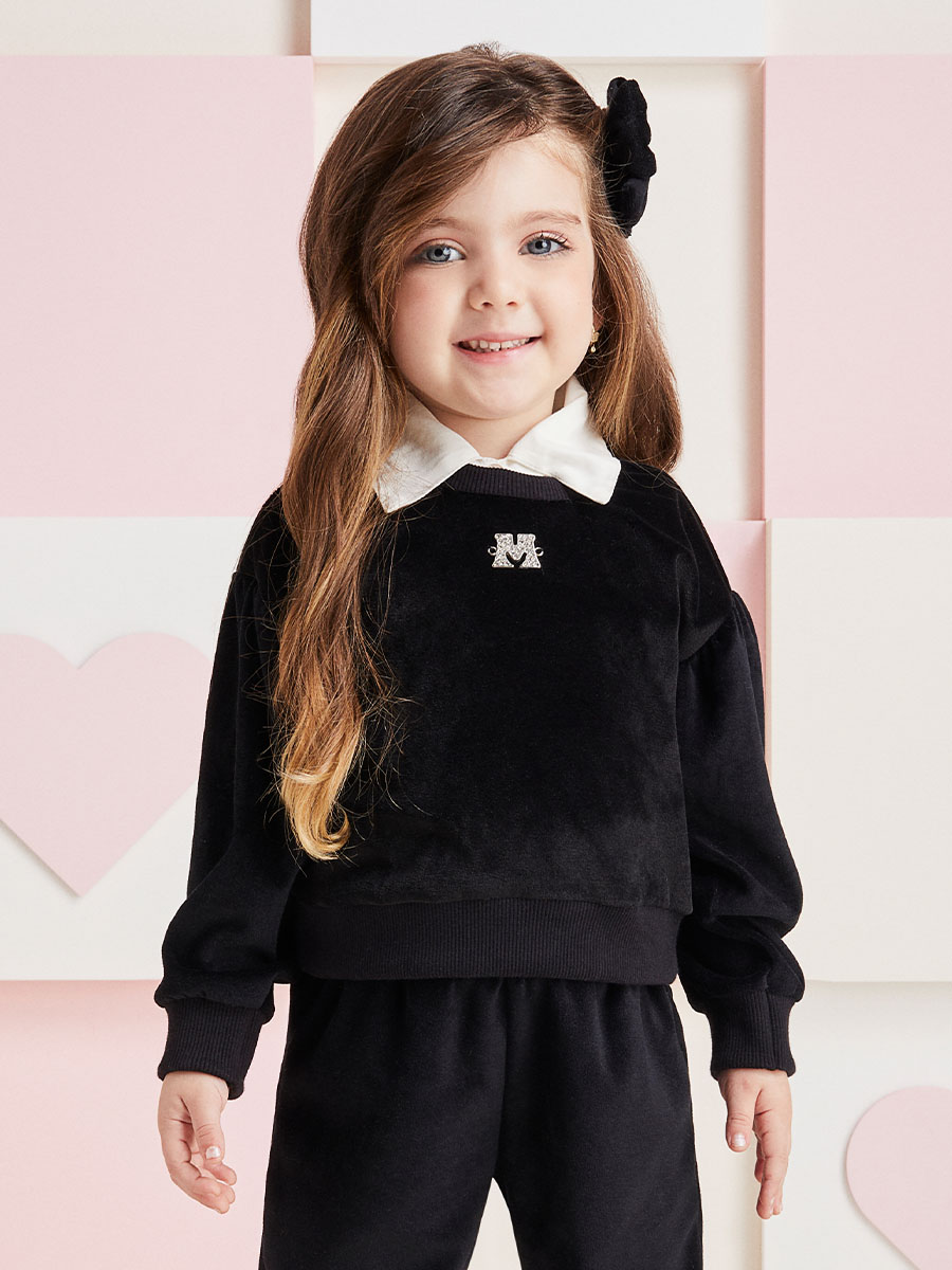 O Conjunto Infantil em preto, confeccionado em plush, é a opção ideal para dias mais frios, mantendo as meninas aquecidas com estilo. A cintura elástica proporciona conforto e flexibilidade. A plaquinha de metal decorativa adiciona um toque de especial.
