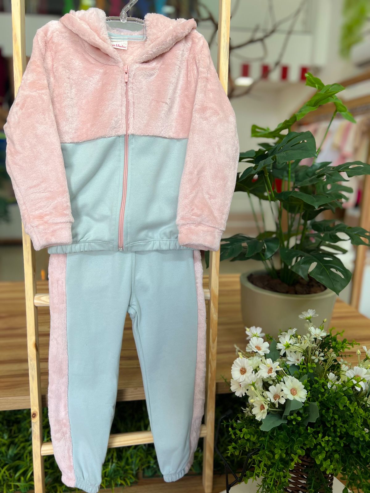 Conjunto moletom da marca Nini e Bambini trazendo detalhes peluciados na jaqueta, bem como no capuz e nas laterais da calça. Um conjuntinho todo confortável para sua filha nos dias mais frios.