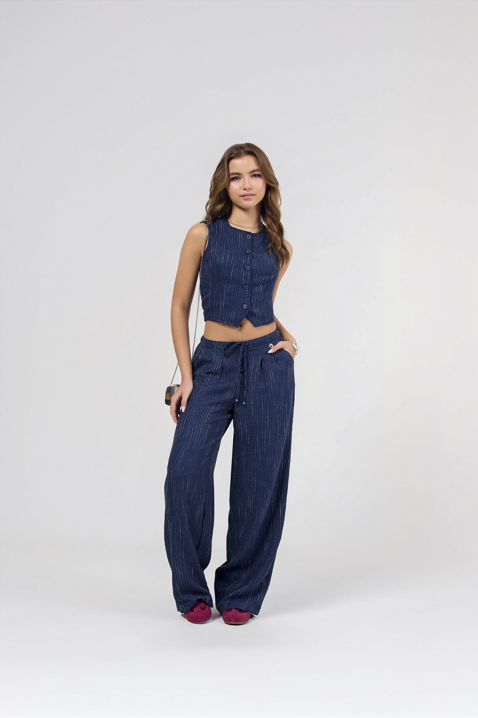 Conjuntom em tecido risca de giz na cor marinho. O conjunto é composto por colete e calça pantalona.
