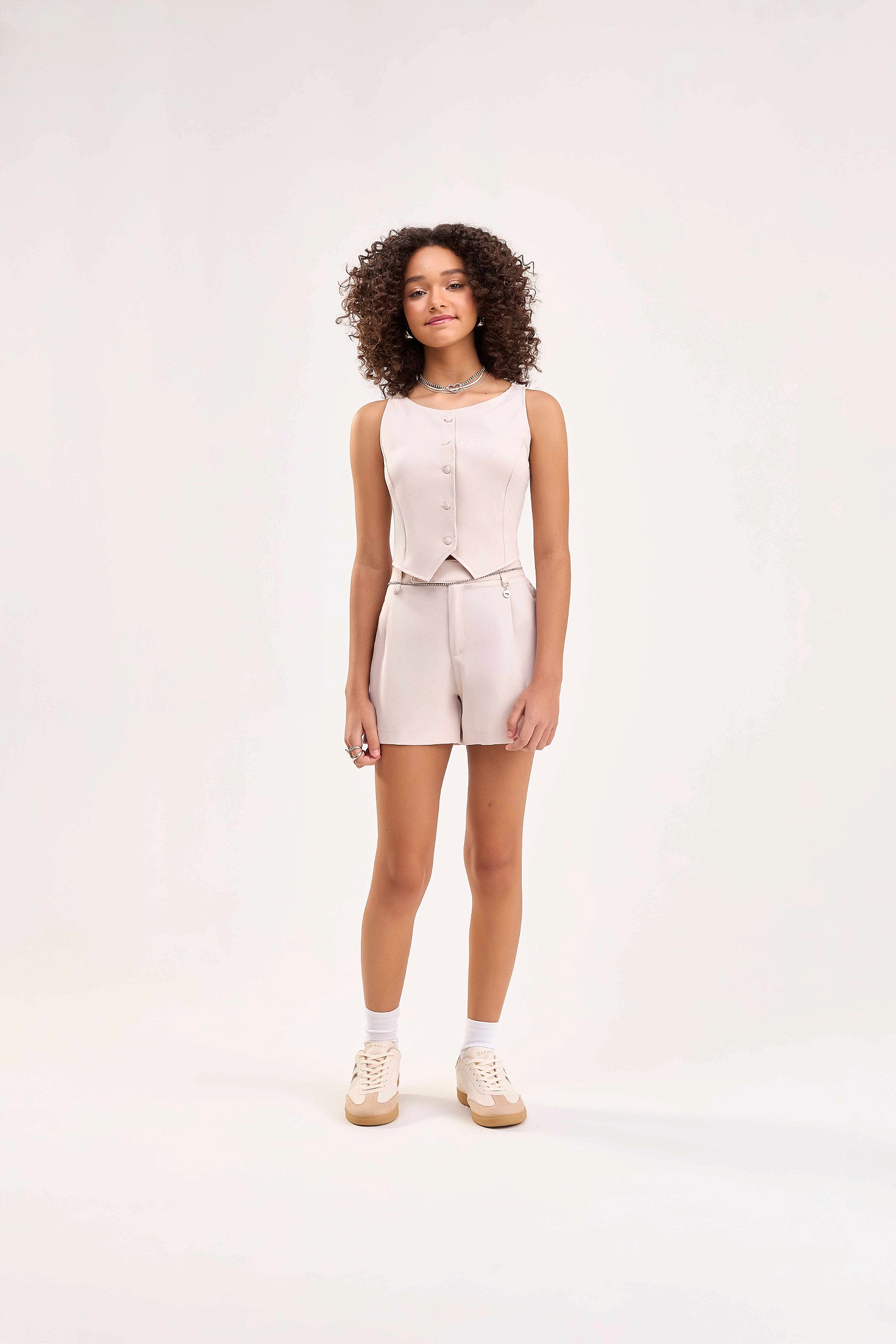 Um conjunto social e mordeno e cheio de estilo. A blusa social estilo colete, possui fechamento frontal com botões, pode ser usado sozinha como peça principal ou sobre uma camisa para toque mais classico. O short de alfaiataria possui cintura alta e oferece caimento impecável e conforto. O tecido é leve e com toque suave. perfeito para compor produções casuais e chiques.