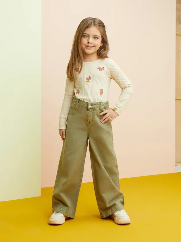 A calça Momi foi desenvolvida em sarja verde com modelagem que enriquece ainda mais seu visual. Nos detalhes traz zíper de metal e etiqueta decorativa, com destaque especial para o bordado na parte de trás. Composição: 100% algodão.
