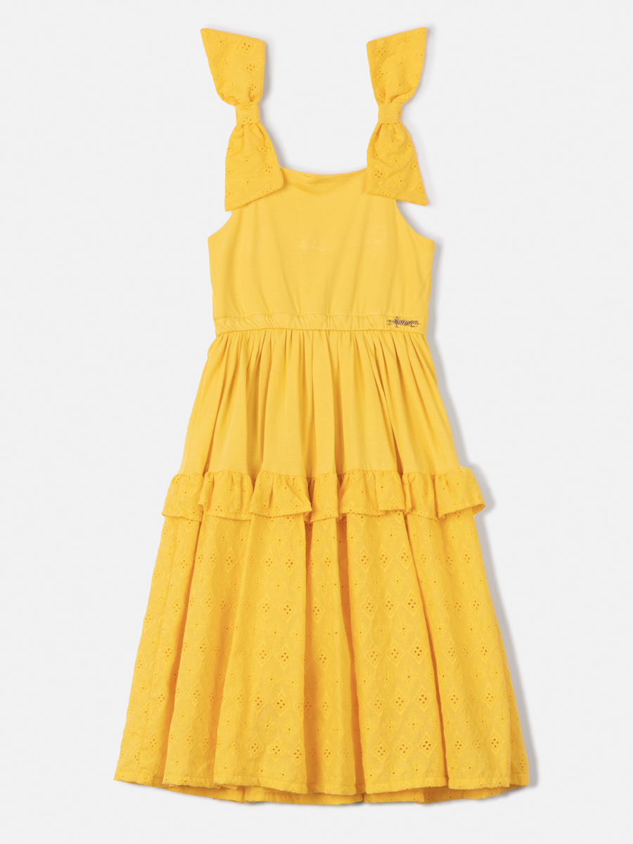 Vestido infantil em laise amarelo Anime. Modelinho delicado que mistura o conforto da malha e o requinte da laise. Possui recorte delicado, elastico na cintura e detalhe de lacinho nas alças. Peça forrada.