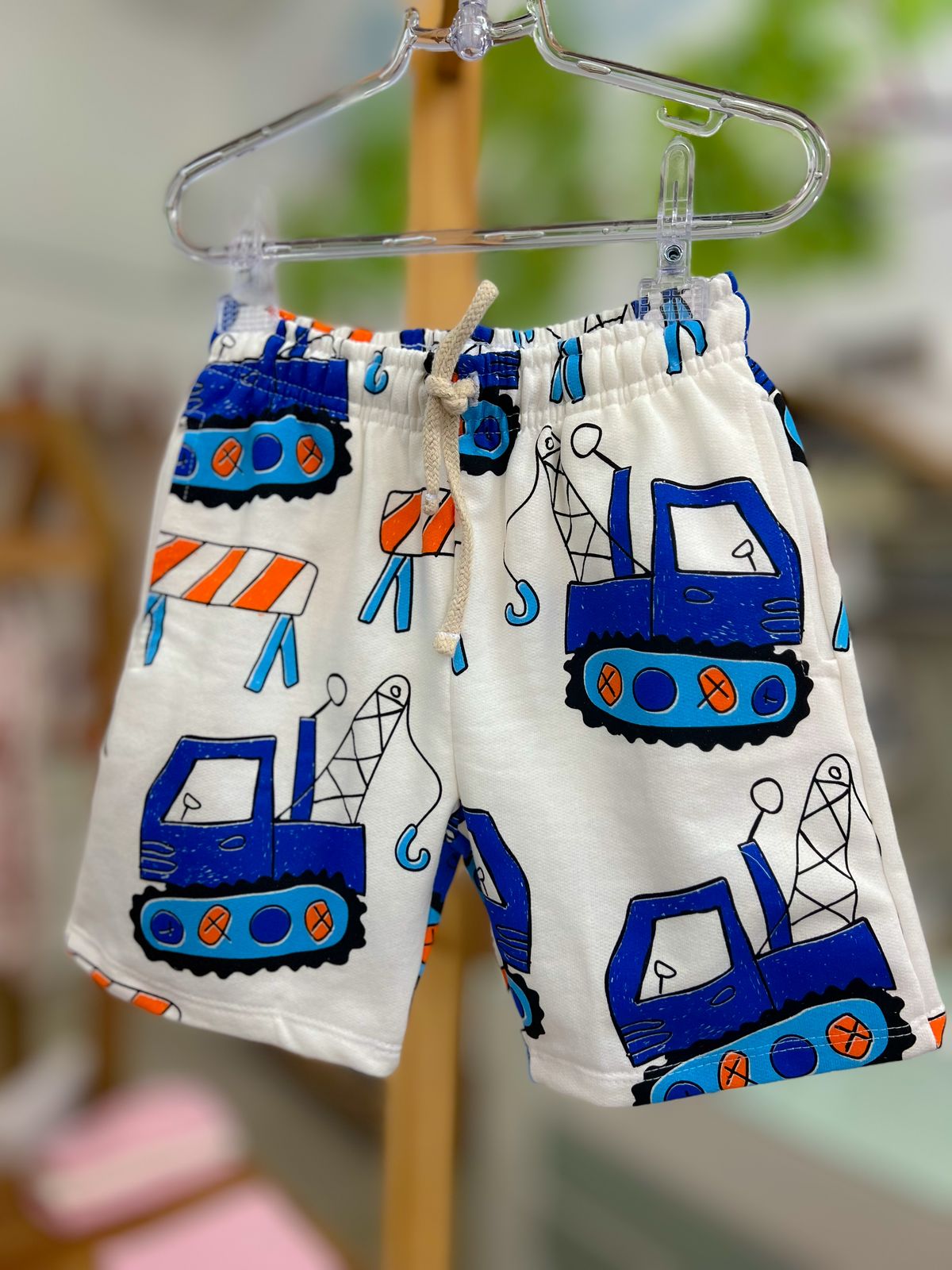 Uma bermuda de moletinho estampada com temática de escavadeira, em cores vibrantes, criando um visual aventureiro e descontraído. Ideal para um estilo alegre e cheio de personalidade.