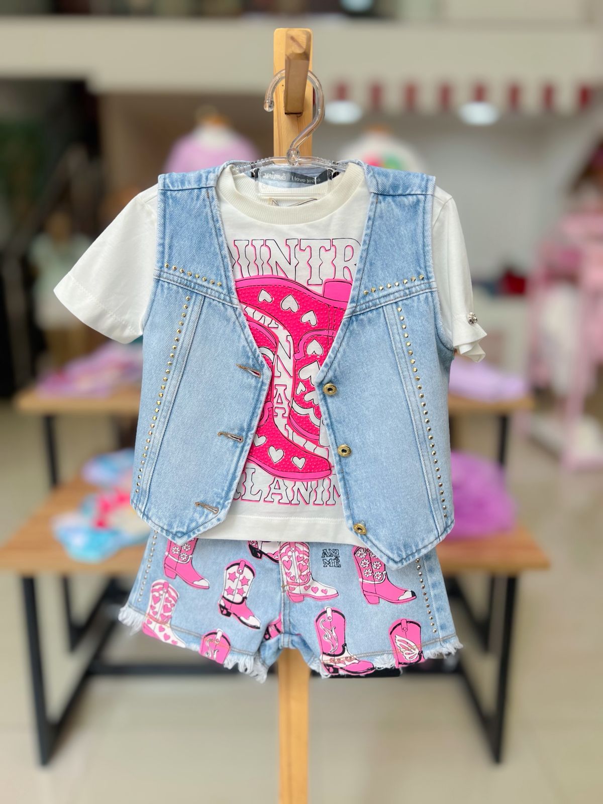Inspirado na country, este shorts jeans vem com estampas de botas , dando um toque lúdico ao clássico. Perfeito para looks de cowgril.