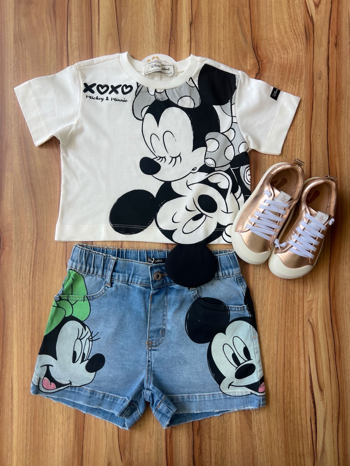 Um clássico repaginado com muito charme! O short jeans traz lavagem clara com patches bordados do Mickey e da Minnie, além de barra desfiada e cintura ajustável. Um item versátil e cheio de personalidade.