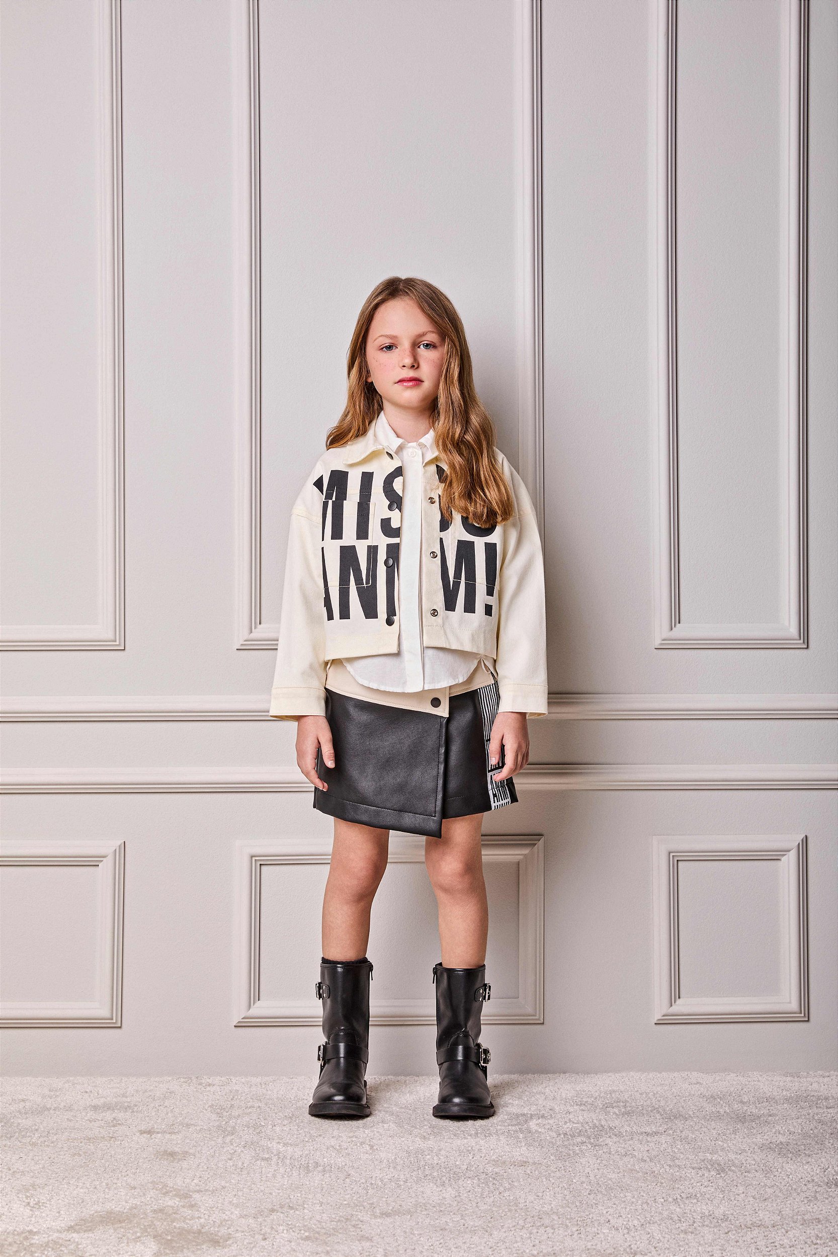 Este shorts aposta em uma estética moderna e marcante, com construção assimétrica que transforma o design em protagonista. O contraste entre o fake leather preto e a pala clara cria um jogo visual sofisticado, destacando linhas limpas e acabamento preciso. Os botões aplicados reforçam a proposta urbana com um toque de alfaiataria contemporânea. O material apresenta textura uniforme e visual estruturado, garantindo caimento firme e elegante. O recorte frontal sobreposto adiciona profundidade ao design, enquanto a lateral com detalhe gráfico imprime identidade e força à peça. Um shorts de presença, pensado para composições ousadas, atuais e alinhadas ao luxo infantil com personalidade.