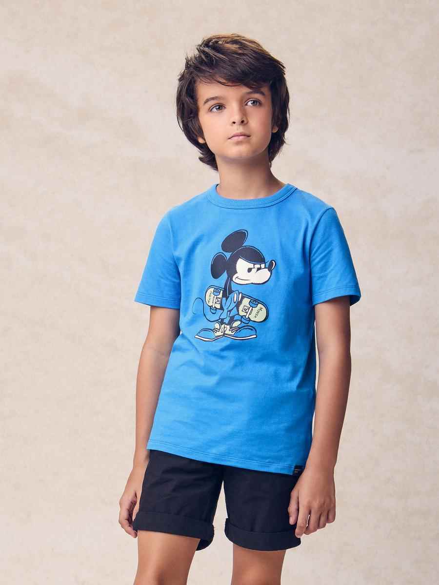Para meninos com espírito aventureiro! A camiseta azul traz o Mickey em versão skatista, com estampa estilizada e visual urbano. Peça perfeita para looks cheios de energia e atitude.