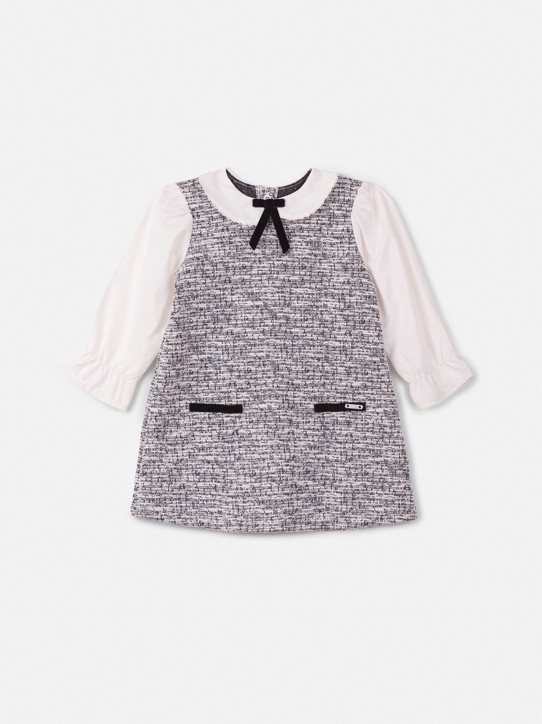 Um toque sofisticado para as pequenas fashionistas! Esse vestido em tweed preto e branco traz uma sobreposição charmosa com blusa de gola boneca. O detalhe das aplicações nos bolsos adiciona um toque clássico e refinado. Ideal para ocasiões especiais, garantindo um visual elegante e cheio de estilo!