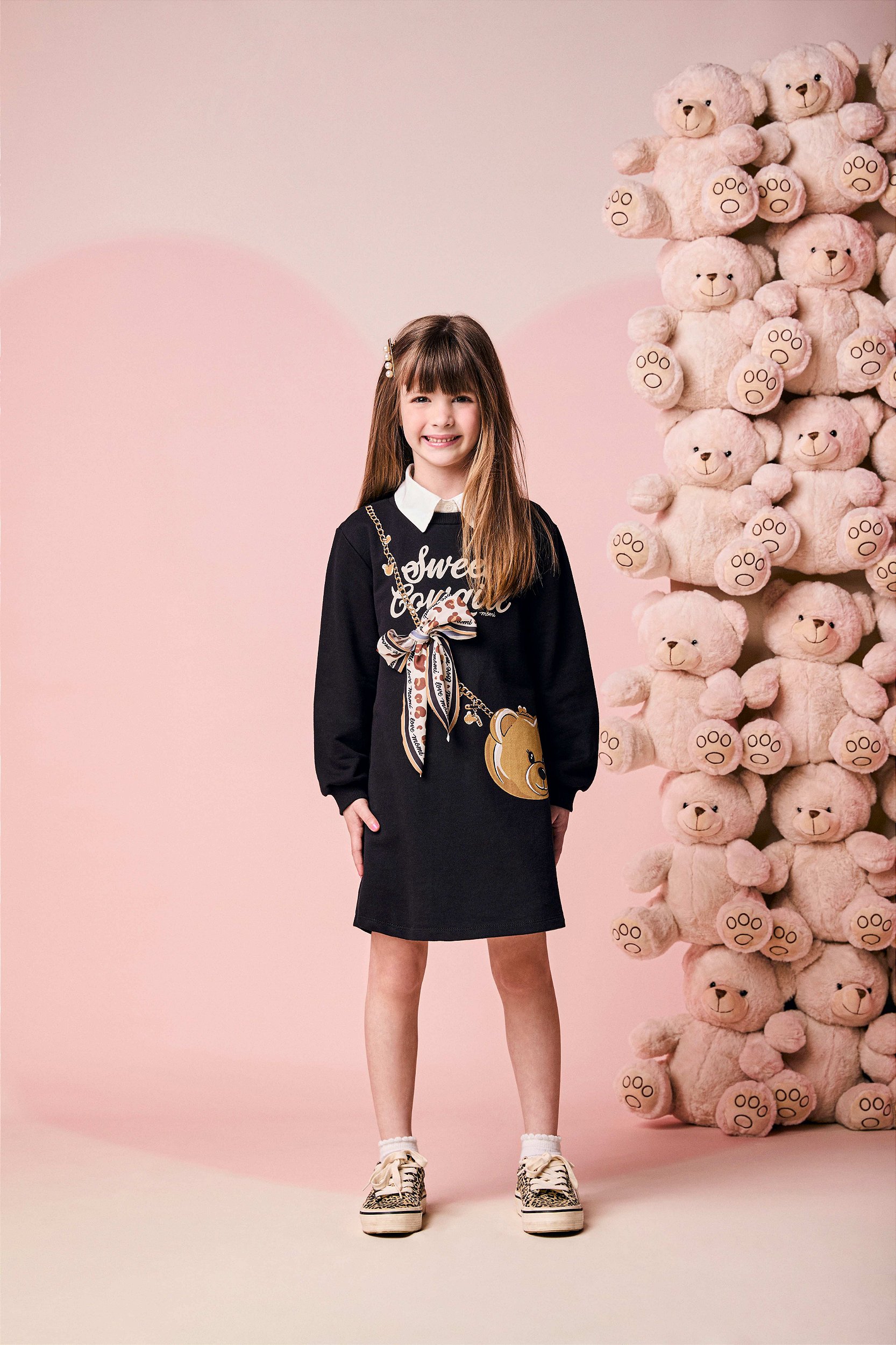 Um look para brilhar e conquistar corações! Esse vestido preto da Momi com aplicação de laço de oncinha com arte de ursinho e detalhes que exalam estilo é a peça ideal para as fashionistas mirins! Não acompanha camisa por baixo.