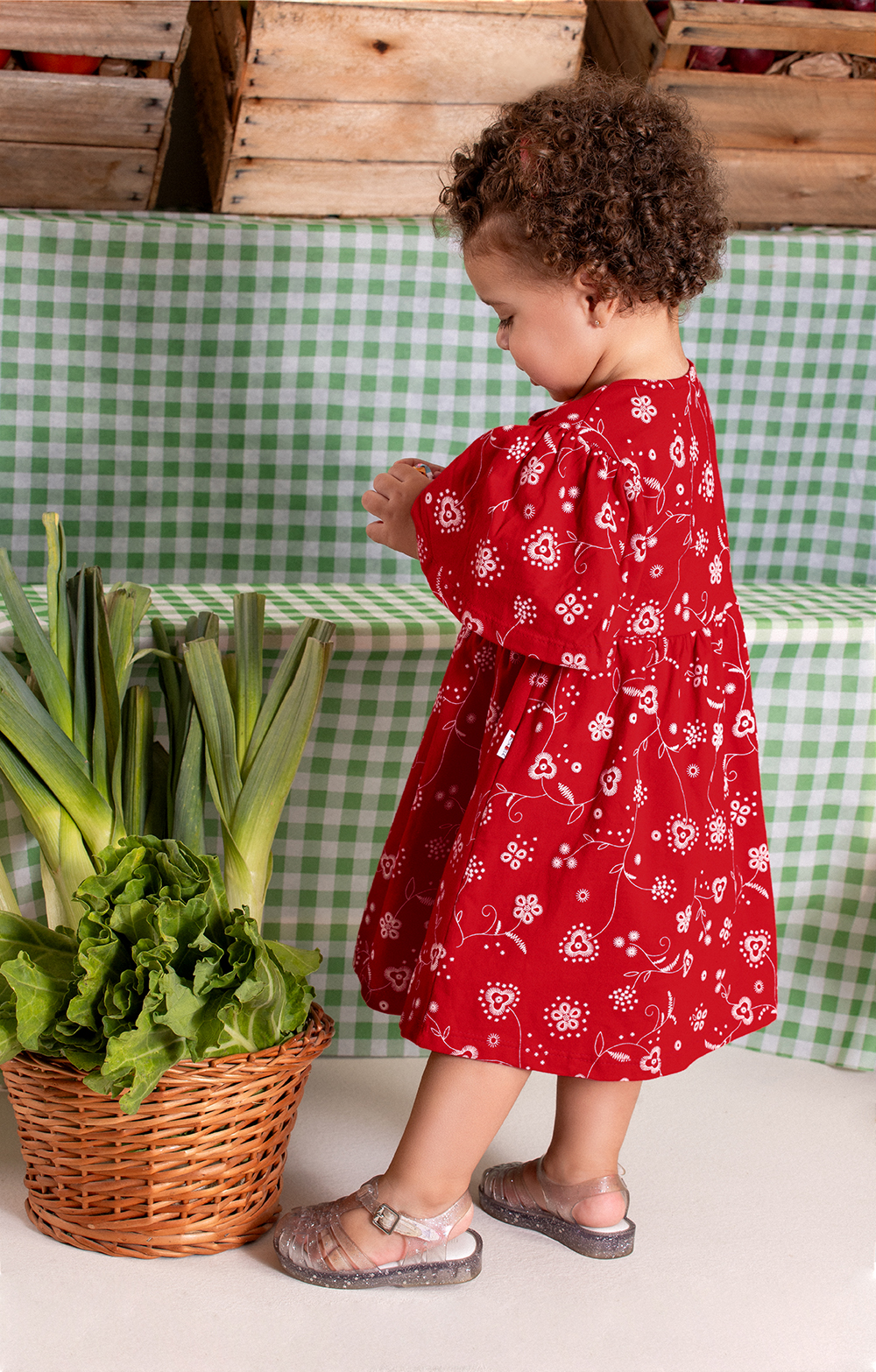Vestido infantil de malha vermelho com detalhes em branco. Perfeito para os dias quentes de verão.